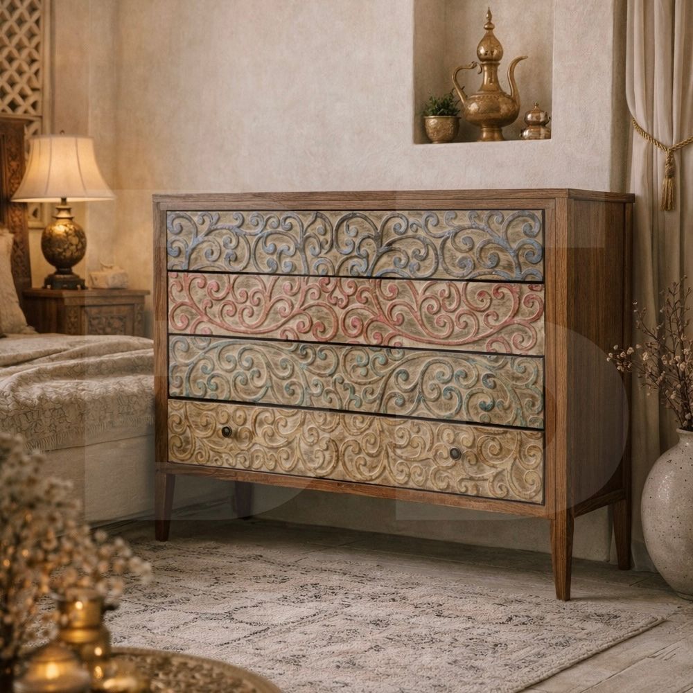 Многослойная покраска придаёт комоду экзотический вид и подчёркивает натуральную текстуру древесины.