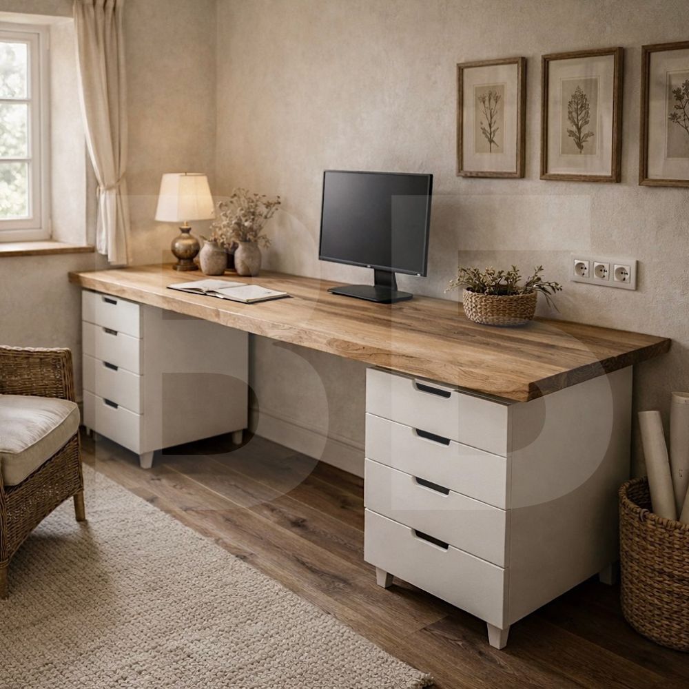 Большой стол с массивной столешницей и двумя опорными тумбами.