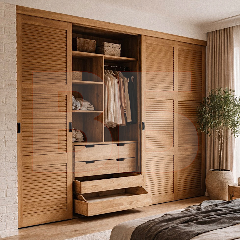Шкаф с жалюзийными фасадами и выдвижными фасадами