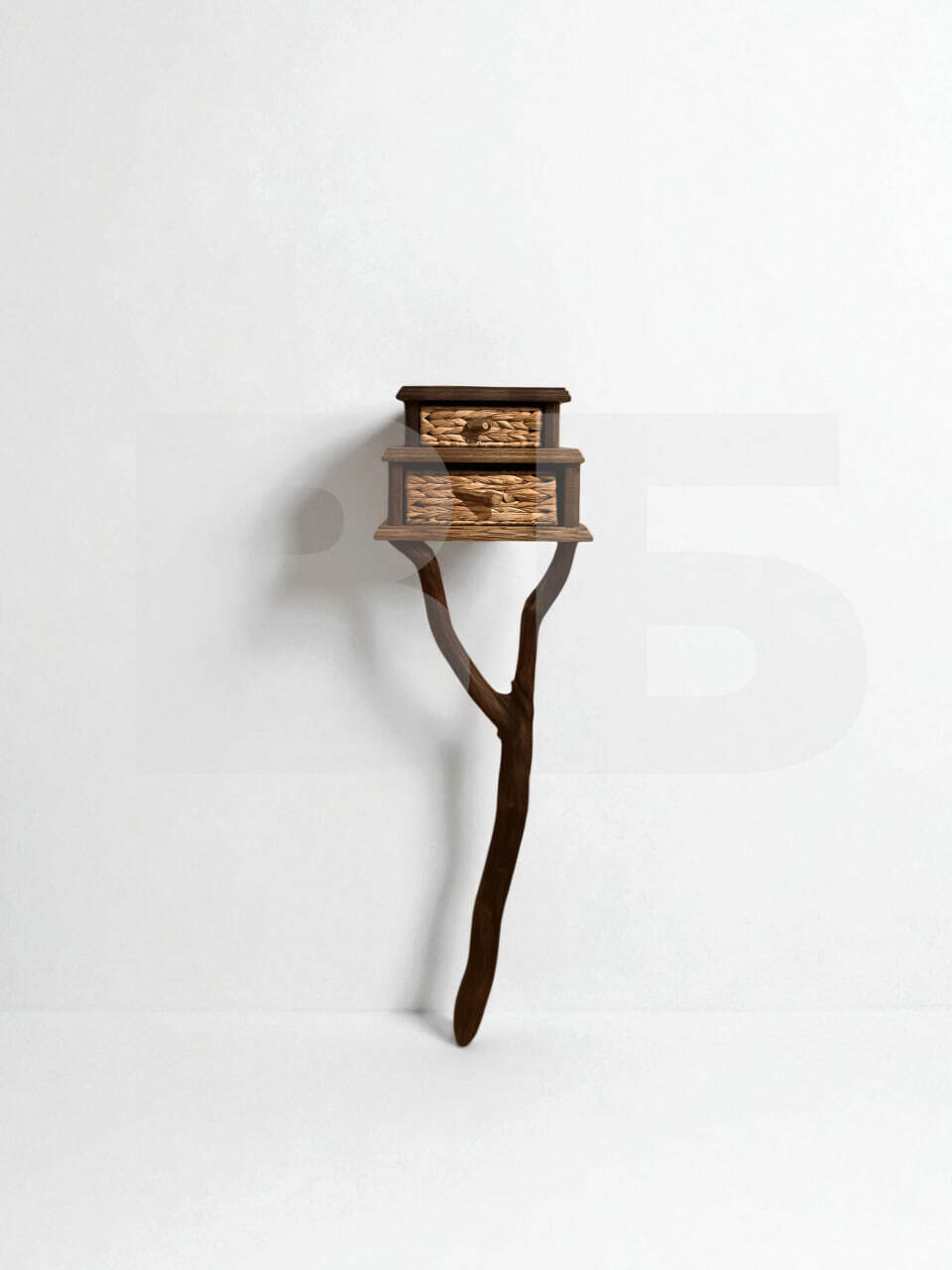 Она полностью собрана из натуральных материалов: корпус сделан из ясеня, а небольшие выдвижные ящички - из джута, с ручками из дубовых веточек.