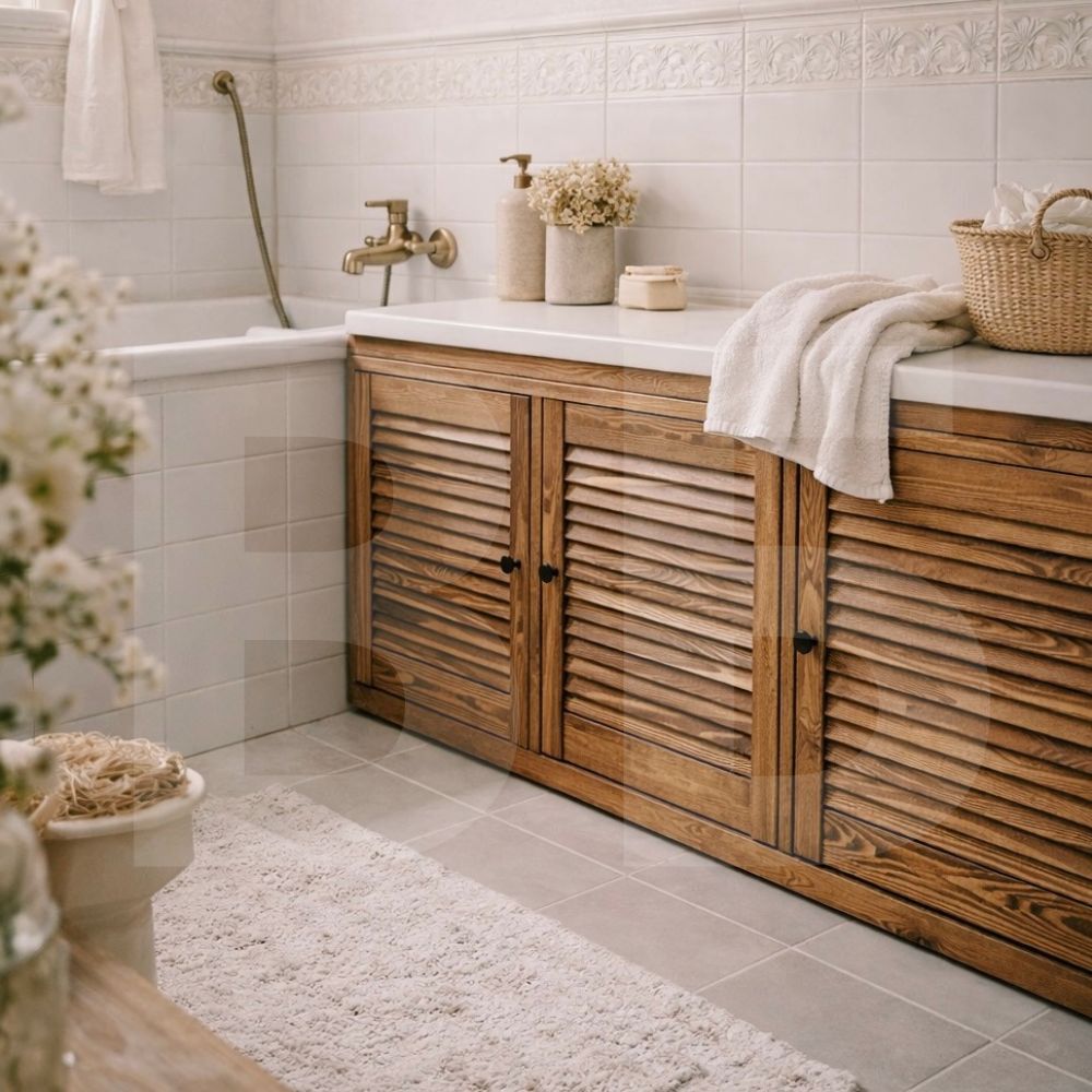 Благодаря жалюзийным панелям, пространство под ванной вентилируется.