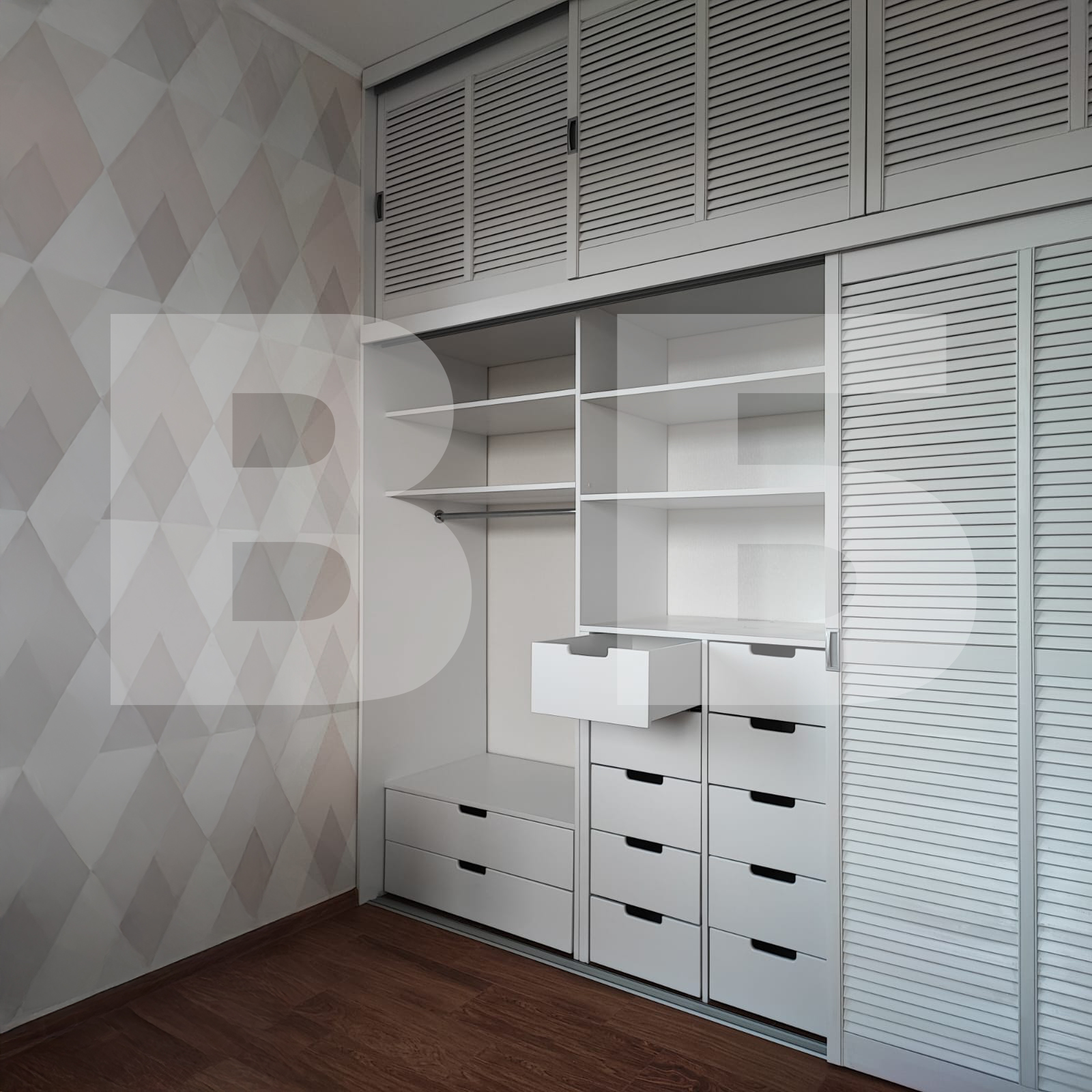 Шкаф с жалюзийными фасадами и выдвижными ящиками
